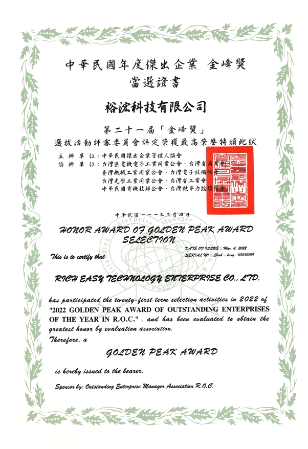 裕浤科技榮獲第21屆金峰獎-十大傑出企業獎